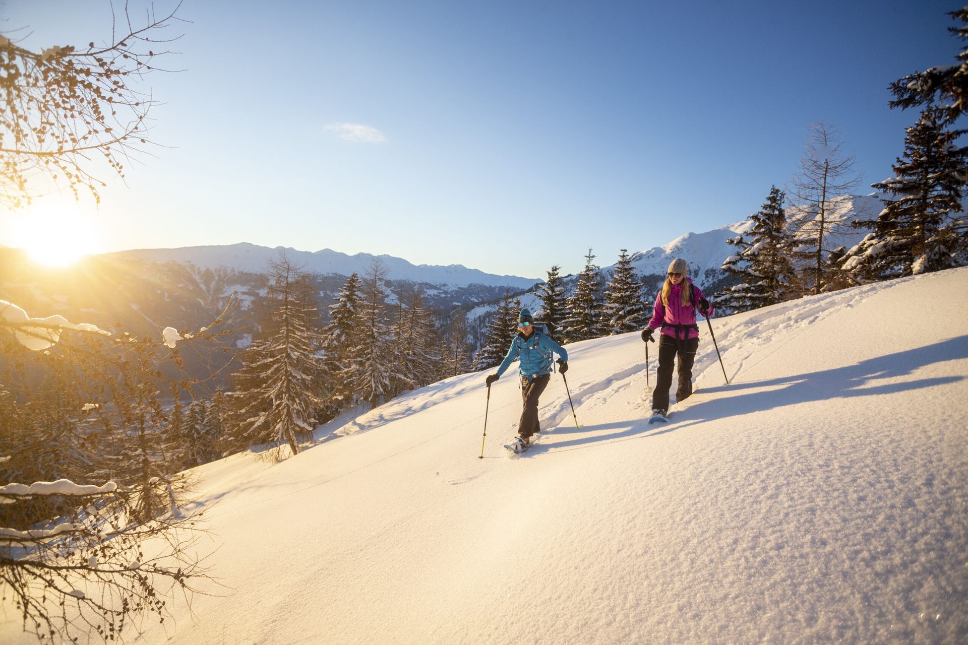 Glitzernder Pulverschnee, majestätische Bergpanoramen und stille Winterwälder machen jede geführte Schneeschuhwanderung zu einem unvergesslichen Naturerlebnis.